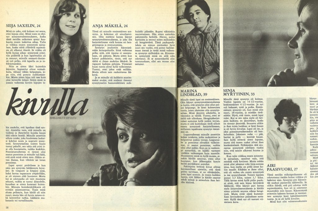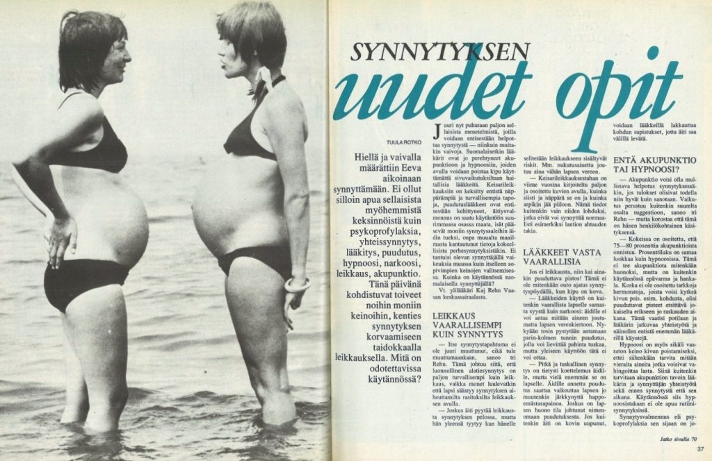 1970-luvun synnytyskipukeskustelusta muistetaan tavallisesti vuodenvaihteessa 1976-1977 käyty kiivas näkemystenvaihto Helsingin Sanomien mielipideosastolla. Aihe oli kuitenkin esillä myös ajan suosituimmissa naistenlehdissä, kuten Annassa, Me Naisissa ja Jaanassa. Kuukausittain ilmestyneet, kaupunkilaisnaisille suunnattu Eeva sekä vasemmistolainen Uusi Nainen eivät innostuneet aiheesta samalla tavalla kuin viikkolehdet, eikä kipukysymys saanut niissä samanlaista näkyvyyttä.