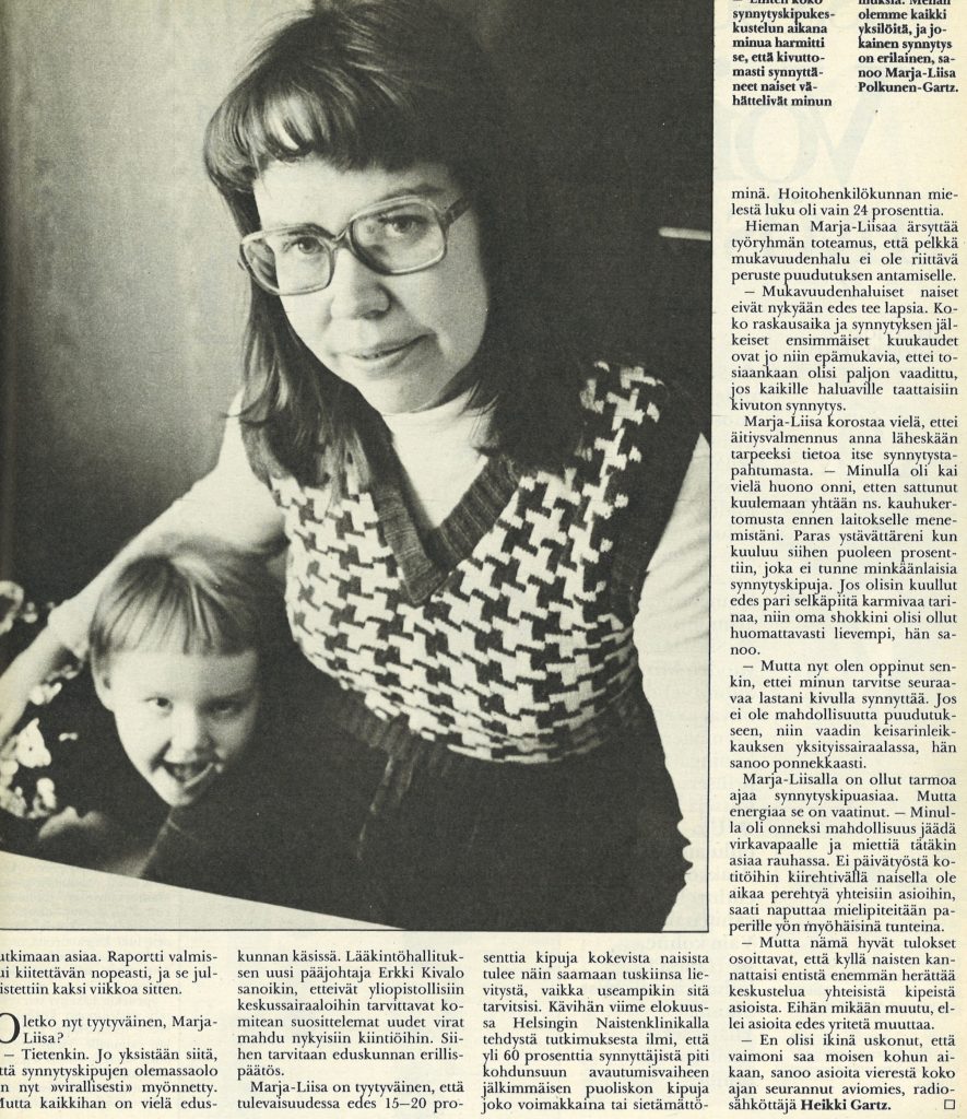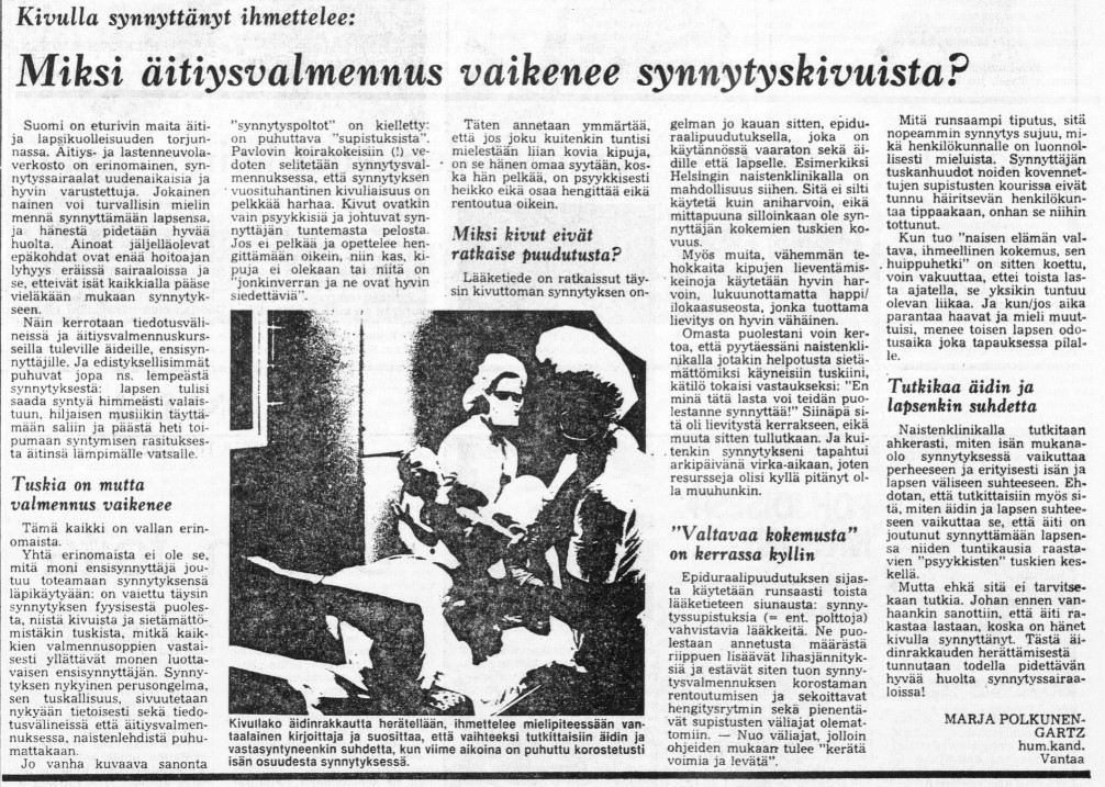 – Marja-Liisa Polkunen-Gartz, ”Miksi äitiysvalmennus vaikenee synnytyskivuista?”, Helsingin Sanomat 24.12.1976