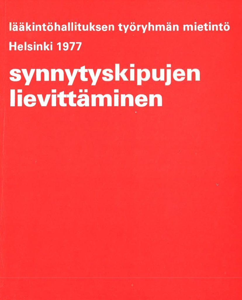 Työryhmän mietintö Synnytyskipujen lievittäminen valmistui alkuvuodesta 1978. Lausunnossa todettiin, että synnytyskivut olivat todellisia: 10-15 prosenttia synnyttäjistä koki ”sietämätöntä kipua”, ja viidennes tarvitsi epiduraalipuudutuksen. Vain 5-15 prosenttia synnytti kivuttomasti. Mietinnössä suositeltiin lisäanestesiahenkilökunnan palkkaamista. Synnytykset oli myös keskitettävä suurempiin sairaaloihin.