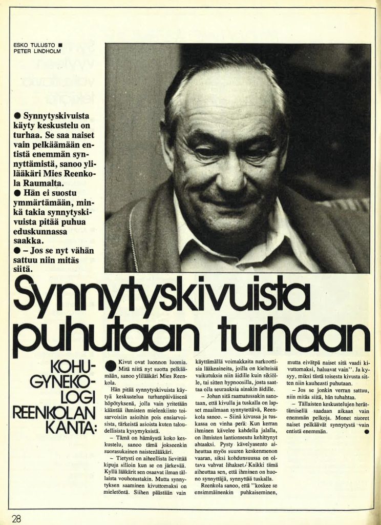 Myös gynekologi, kohutut muistelmateoksensa juuri julkaissut Mies Reenkola (1908-1988) piti kysymystä ”turhanpäiväisenä höpötyksenä” ja ”hämäyksenä”. Hän kommentoi Jaana-lehdessä, että synnytyskivut olivat ”luonnon luomia”. Hinta pystyasennossa, kahdella jalalla kulkevasta ihmisestä oli naisen ahdas lantionseutu ja kivulias synnytys. Kuten Reenkola muistutti, Raamatussakin sanottiin, että ”kivulla ja tuskalla on lapset maailmaan synnytettävä [–] jos se jonkin verran sattuu, niin mitäs siitä”.